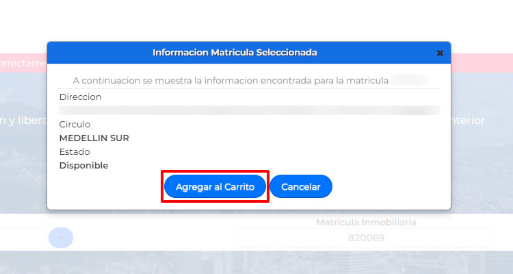 Después de ingresar los datos, me mostraron la información de mi propiedad para que la revisara y confirmara. ¡Asegúrate de que todo esté correcto! Luego, hice clic en el botón azul que decía “agregar al carrito”. Ah, y si por alguna razón la dirección no coincide, puedes cancelar y verificar los datos nuevamente.