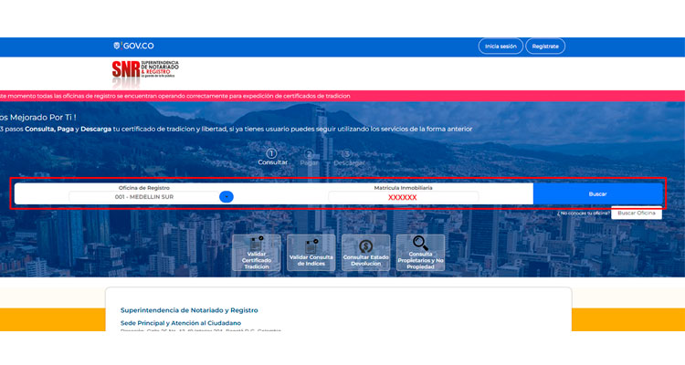 2. Ingresa los datos solicitados: la oficina y el número de matrícula Inmobiliaria.